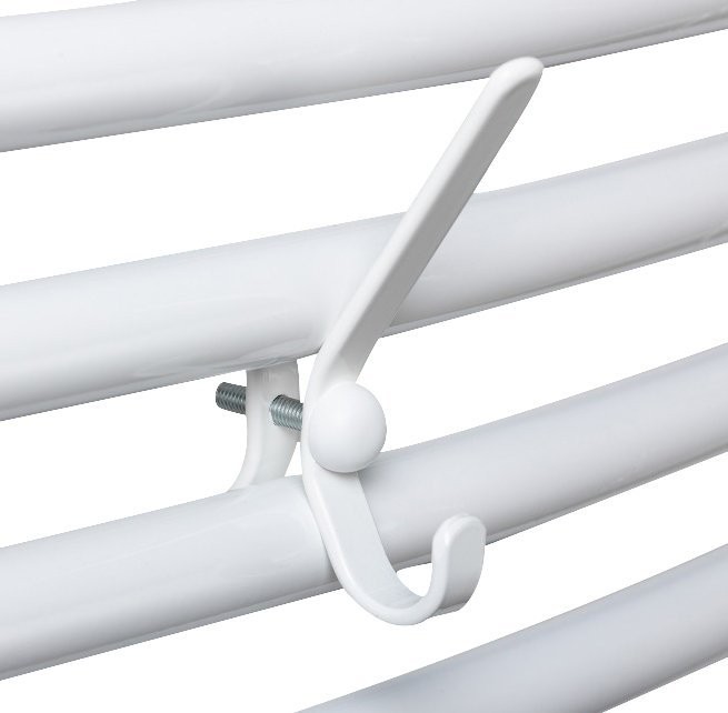 Dzięki prostej konstrukcji haczyk jest łatwy w montażu i nie wymaga skomplikowanych narzędzi, stanowiąc funkcjonalne uzupełnienie grzejników drabinkowych.