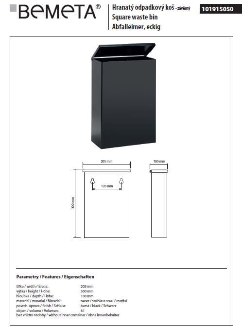 BEMETA 101915050 Kosz na śmieci ścienny 6 l czarny