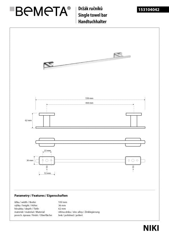 BEMETA 153104042 NIKI pojedynczy wieszak na ręczniki 450 mm