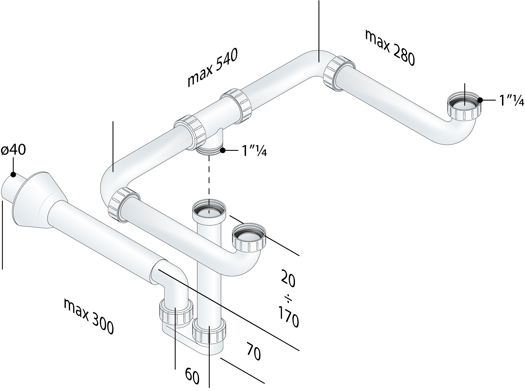BRUCKNER MOSQUITO to nowoczesny, oszczędzający miejsce syfon do podwójnej umywalki, wyposażony w przyłącze 5/4" i odpływ DN40. Zaprojektowany z myślą o maksymalnym wykorzystaniu przestrzeni, odprowadza wodę bezpośrednio pod umywalką do ściany, a następnie pionowo w dół do odpływu, co czyni go idealnym wyborem do szafek umywalkowych, umywalek z półką oraz łazienek bezbarierowych.