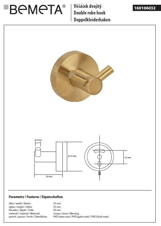 Bemeta SABLO to elegancki podwójny haczyk, który z pewnością nada Twojej łazience nieco stylu. Jego wymiary to 55 mm szerokości, 55 mm wysokości i 50 mm głębokości, dzięki czemu nie zajmuje zbyt wiele miejsca na ścianie.
