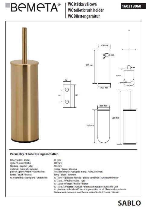 Bemeta SABLO: Szczotka do wc wolnostojąca/wisząca, czarny wkład 160313060 złoty mat