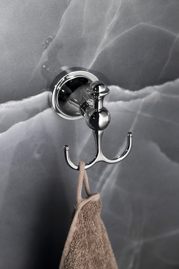 Wieszak podwójny Gedy NEVIS to doskonałe rozwiązanie do eleganckiej łazienki lub toalety. Wykonany z wytrzymałego metalowego stopu i pokryty lśniącym chromem, idealnie wpisuje się w estetykę retro, dodając wnętrzu klasy i porządku. Dwa haczyki umożliwiają wygodne zawieszenie ręczników, szlafroków czy akcesoriów kąpielowych.