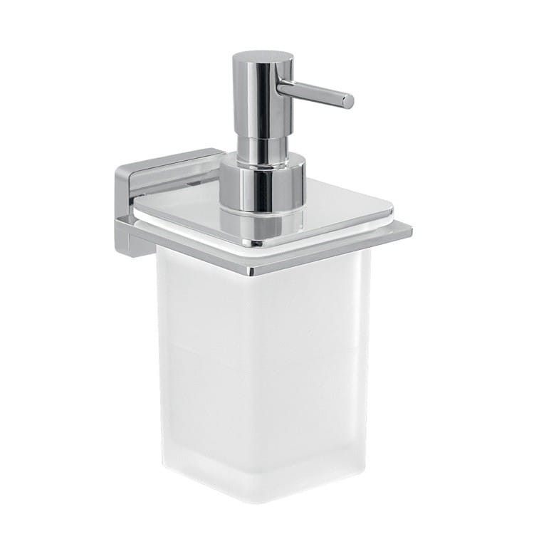 Elegancki i praktyczny dozownik łazienkowy. W całości wykonany ze szkła satynowego. Uchwyt metalowy pokryty chromem.