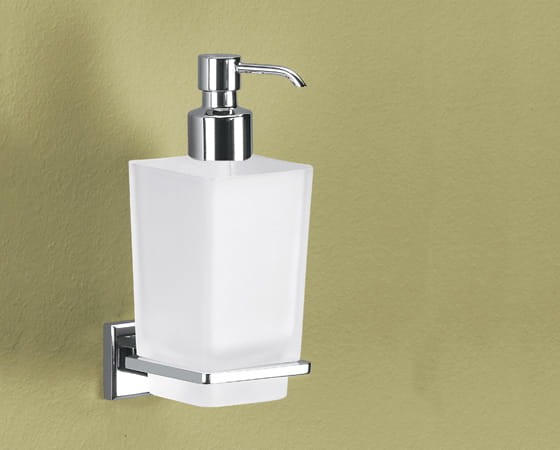 Elegancki i praktyczny dozownik w całości wykonany ze szkła satynowego. Uchwyt metalowy pokryty chromem. Montaż do ściany na kołki rozporowe.