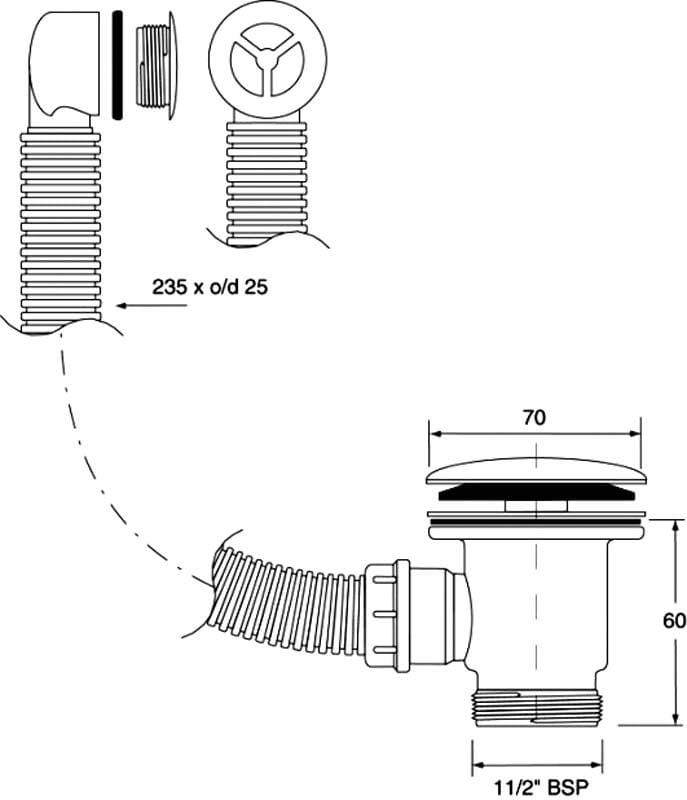 Spust zlewozmywakowy 1.1/2″x70mm z korkiem „klik-klak”. Przelew z okrągłym odejściem.