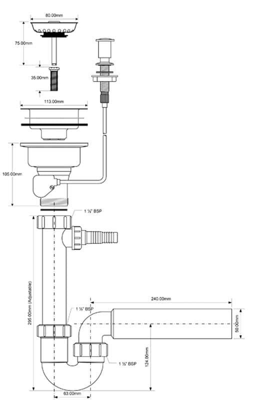 McAlpine HC7+PUFS113-CP-25 Syfon zlew.rurowy 3,5"x50mm z podłą.do pralki lub zmywarki, spust z mech.automatycznym ,przelew