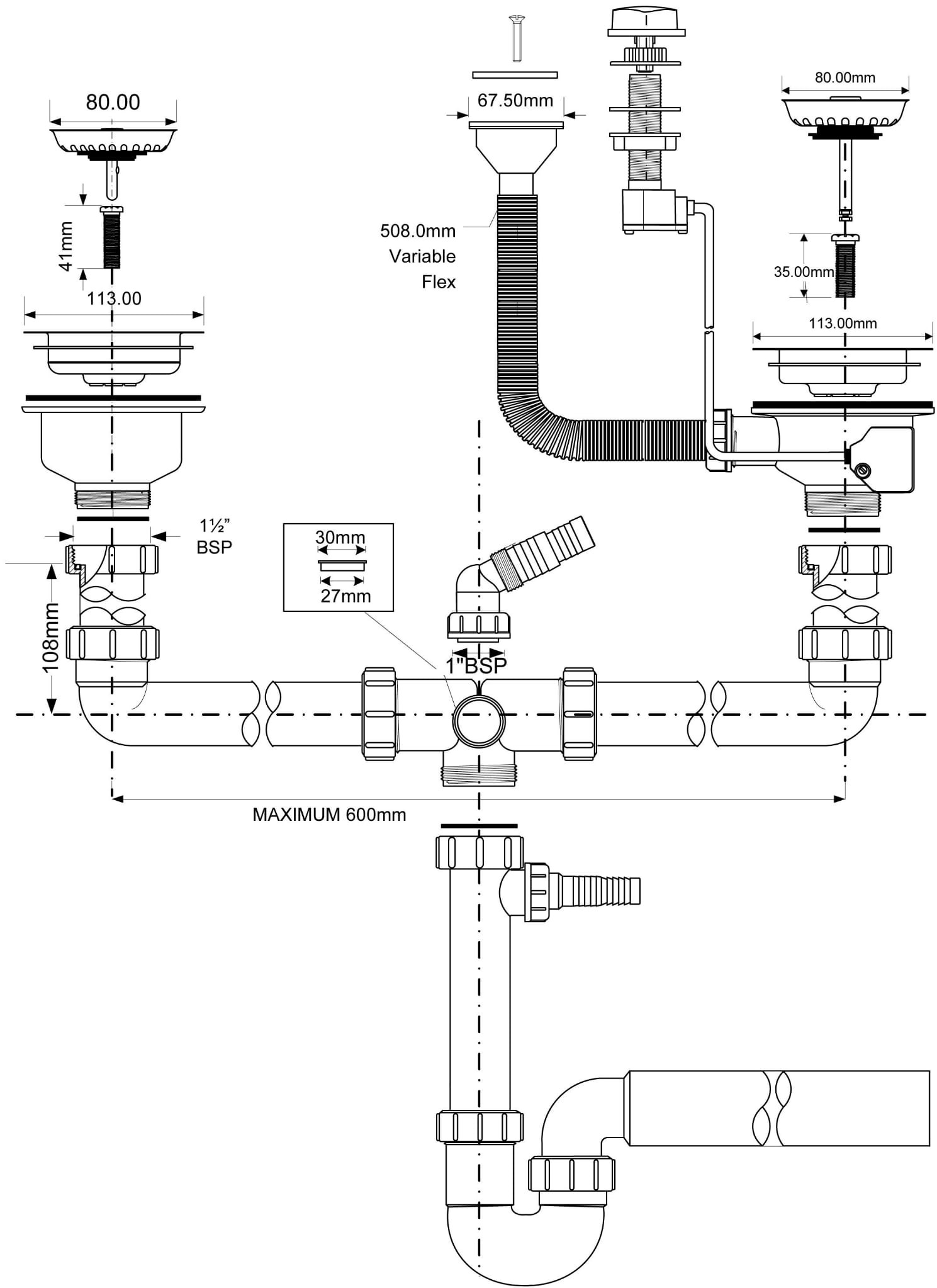 Syfon zlewozmywakowy podwójny rurowy 1.1/2″x50mm ze spustami 1.1/2″x113mm z podłączeniem do pralki i zmywarki. Z przelewem z podłączeniem horyzontalnym do ociekacza. Automatyczne otwieranie spustu.