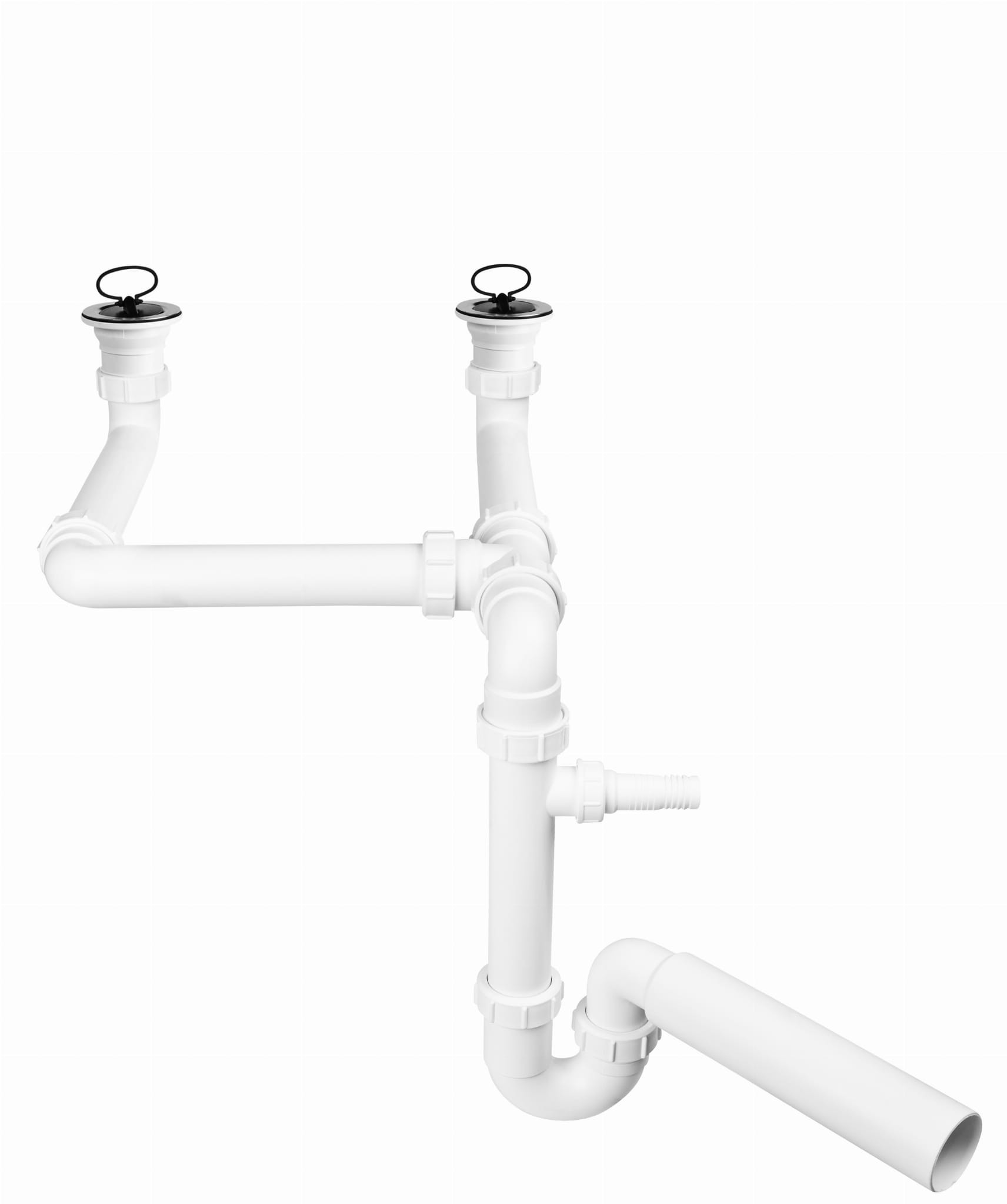 Syfon zlewozmywakowy podwójny rurowy 1.1/2x50mm ze spustem 1.1/2x70mm, z podłączeniem do pralki lub zmywarki, z przedłużkami umożliwiającymi wykorzystanie przestrzeni pod zlewozmywakiem.