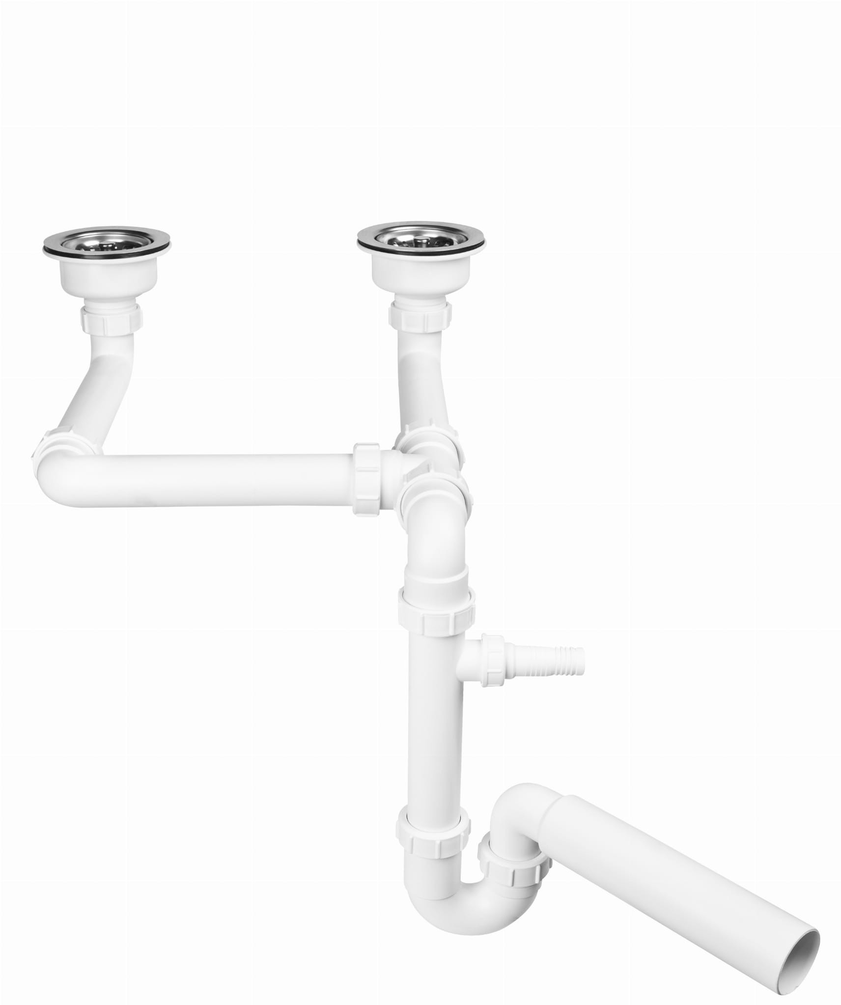 Syfon zlewozmywakowy podwójny rurowy 1.1/2x50mm ze spustami 1.1/2x113mm, z podłączeniem do pralki lub zmywarki, z przedłużkami umożliwiającymi wykorzystanie przestrzeni pod zlewozmywakiem.