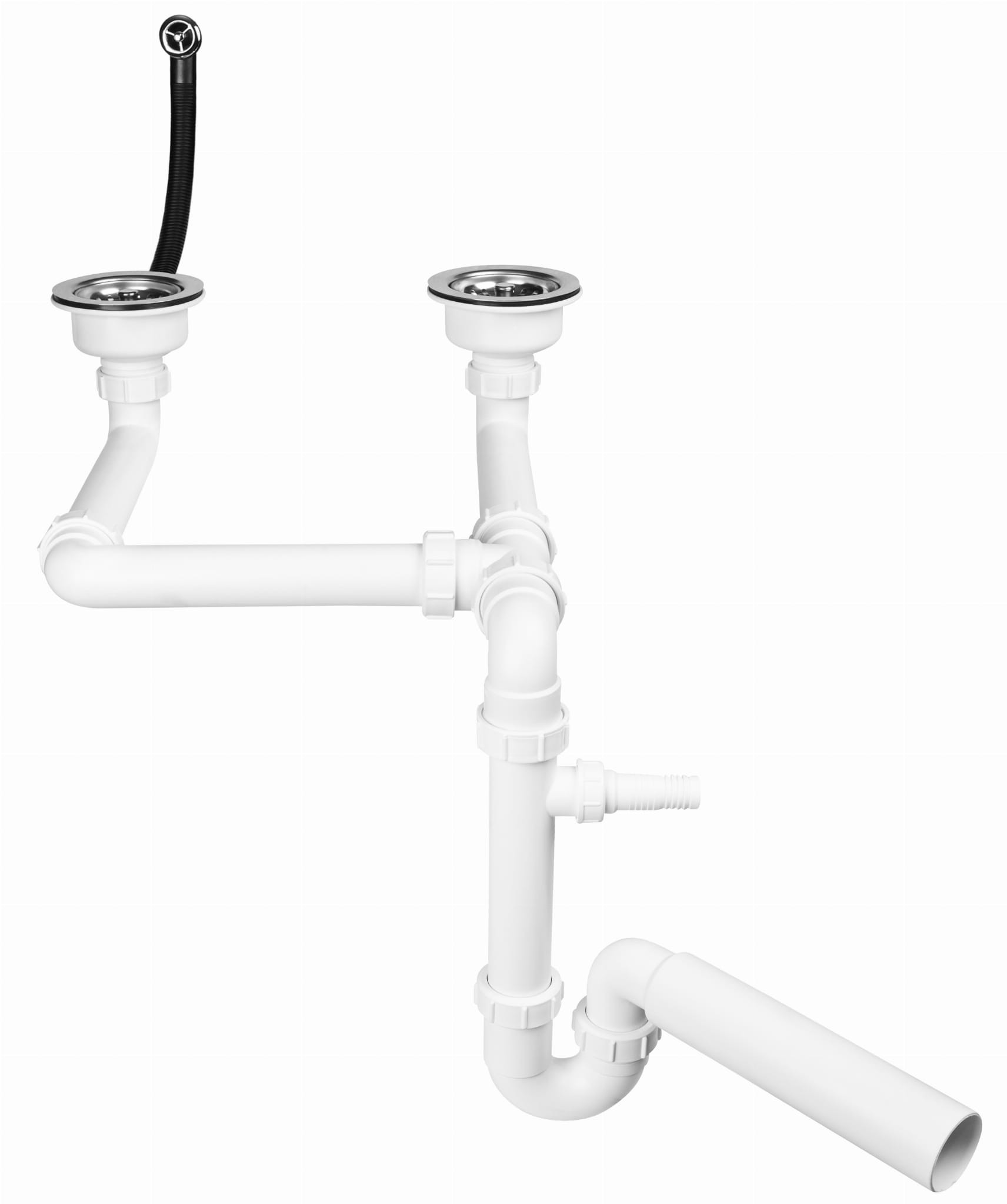 Syfon zlewozmywakowy podwójny rurowy 1.1/2x50mm ze spustami 1.1/2x113mm, z przelewem okrągłym z podłączeniem do pralki lub zmywarki, z przedłużkami umożliwiającymi wykorzystanie przestrzeni pod zlewozmywakiem. Dostępna opcja z przelewem prostokątnym.