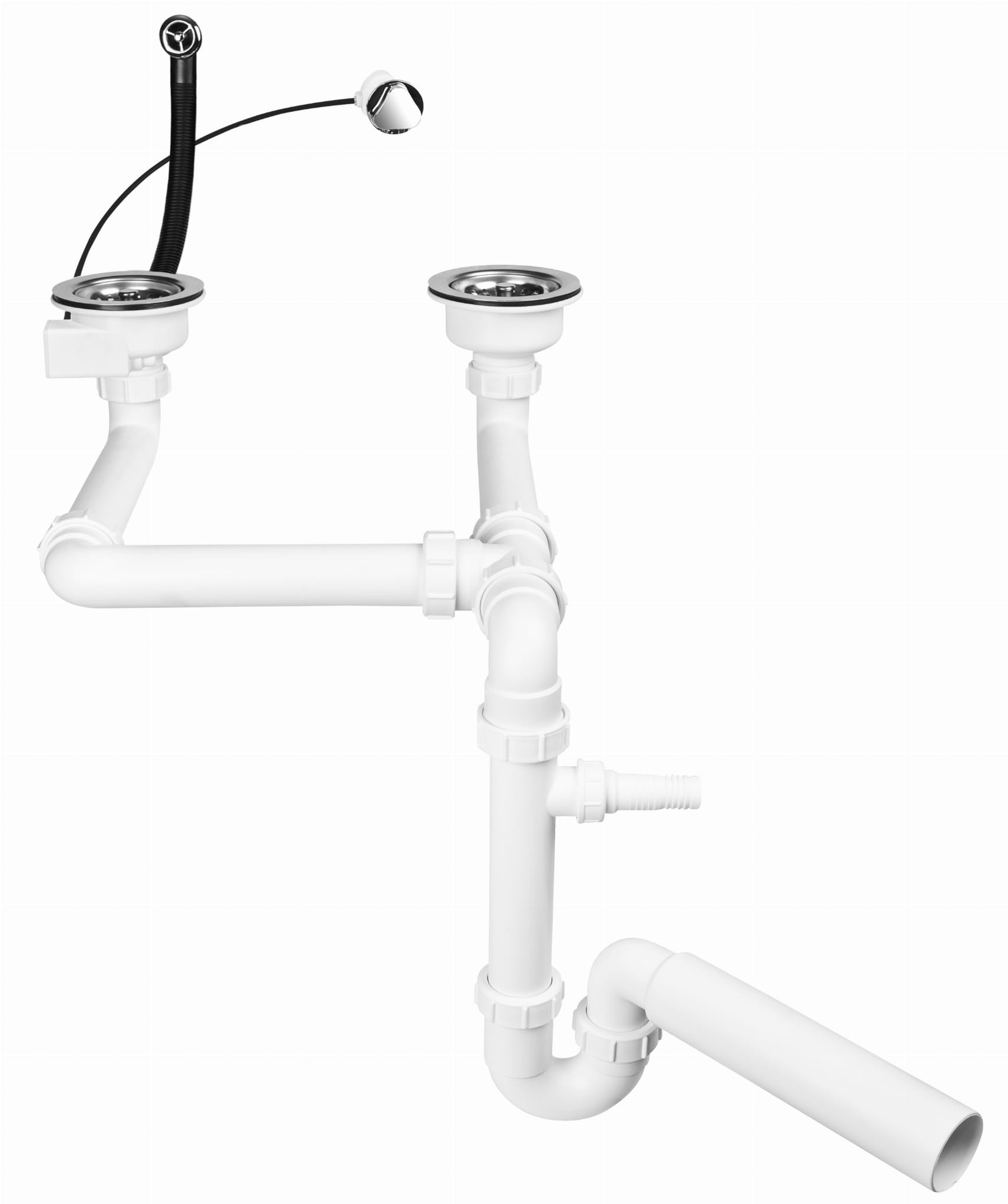 Syfon zlewozmywakowy podwójny rurowy 1.1/2x50mm ze spustami 1.1/2x113mm, z przelewem okrągłym z podłączeniem do pralki lub zmywarki, z przedłużkami umożliwiającymi wykorzystanie przestrzeni pod zlewozmywakiem. Dostępna opcja z przelewem prostokątnym. Automatyczne otwieranie spustu.