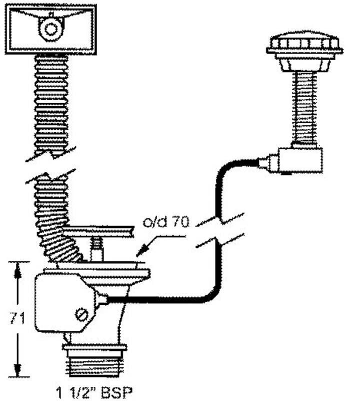 Spust zlewozmywakowy 1.1/2″x70mm z sitem ze stali nierdzewnej i korkiem automatycznym. Przelew z prostokątnym podłączeniem do ociekacza.