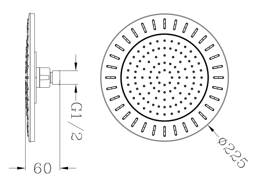 Średnica: ø 22,5 cm; grubość: 1,8 cm; podłączenie: ½".