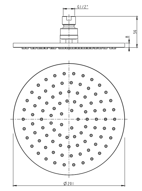 Średnica: ø 20 cm; grubość: 0,9 cm; podłączenie: ½'.