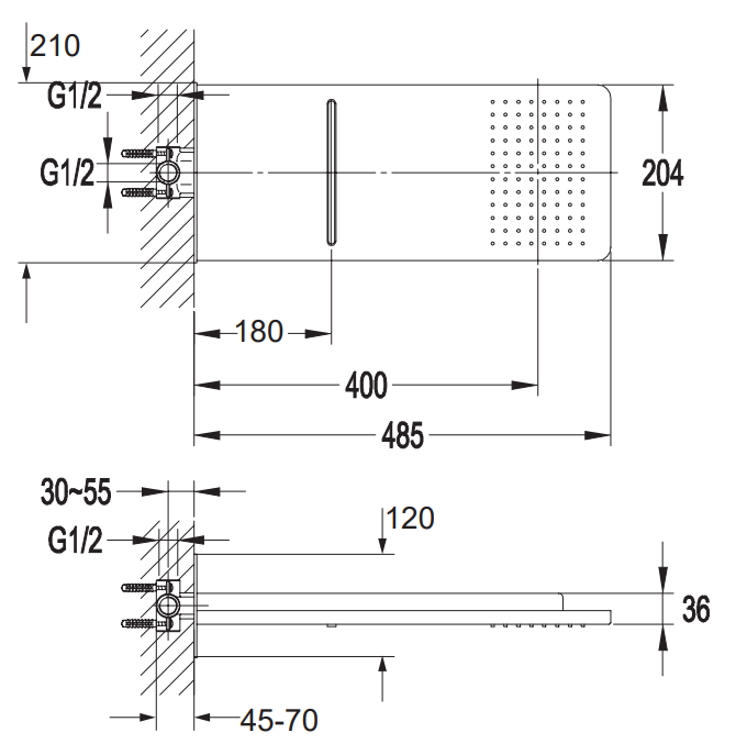 Wymiary: długość talerza: 48,5 cm; odległość wylewu kaskady od ściany: 16 cm; szerokość: 20,4 cm; grubość: 3,6 cm; podłączenie: ½".