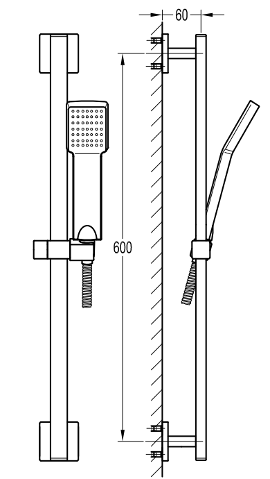 Drążek prysznicowy mosiężny, długość 66 cm, rozstaw mocowań 60 cm.