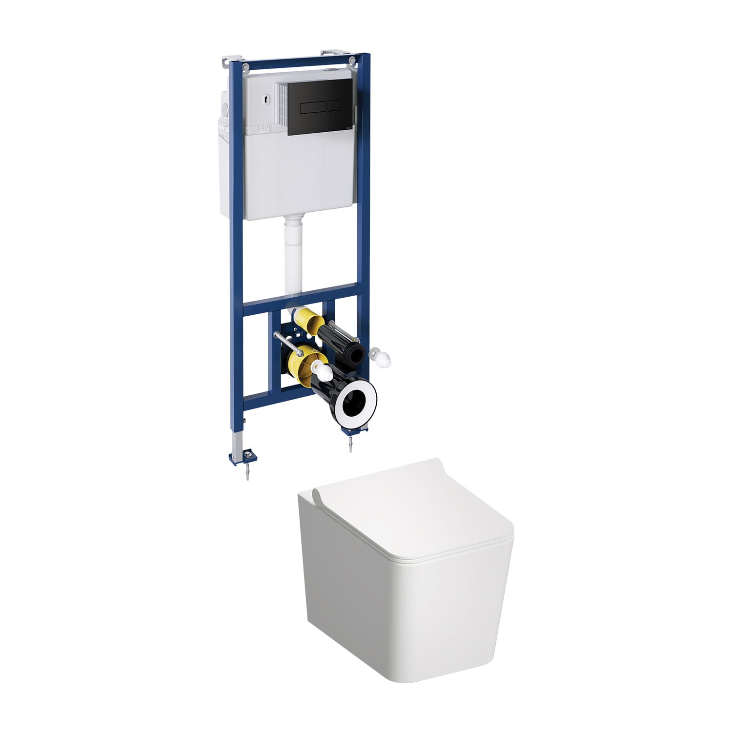 W zestawie znajduje się wisząca miska toaletowa OMNIRES BOSTON z deską wolnoopadającą oraz stelaż podtynkowy OMNIRES CLASSIC z czarnym przyciskiem spłukującym.