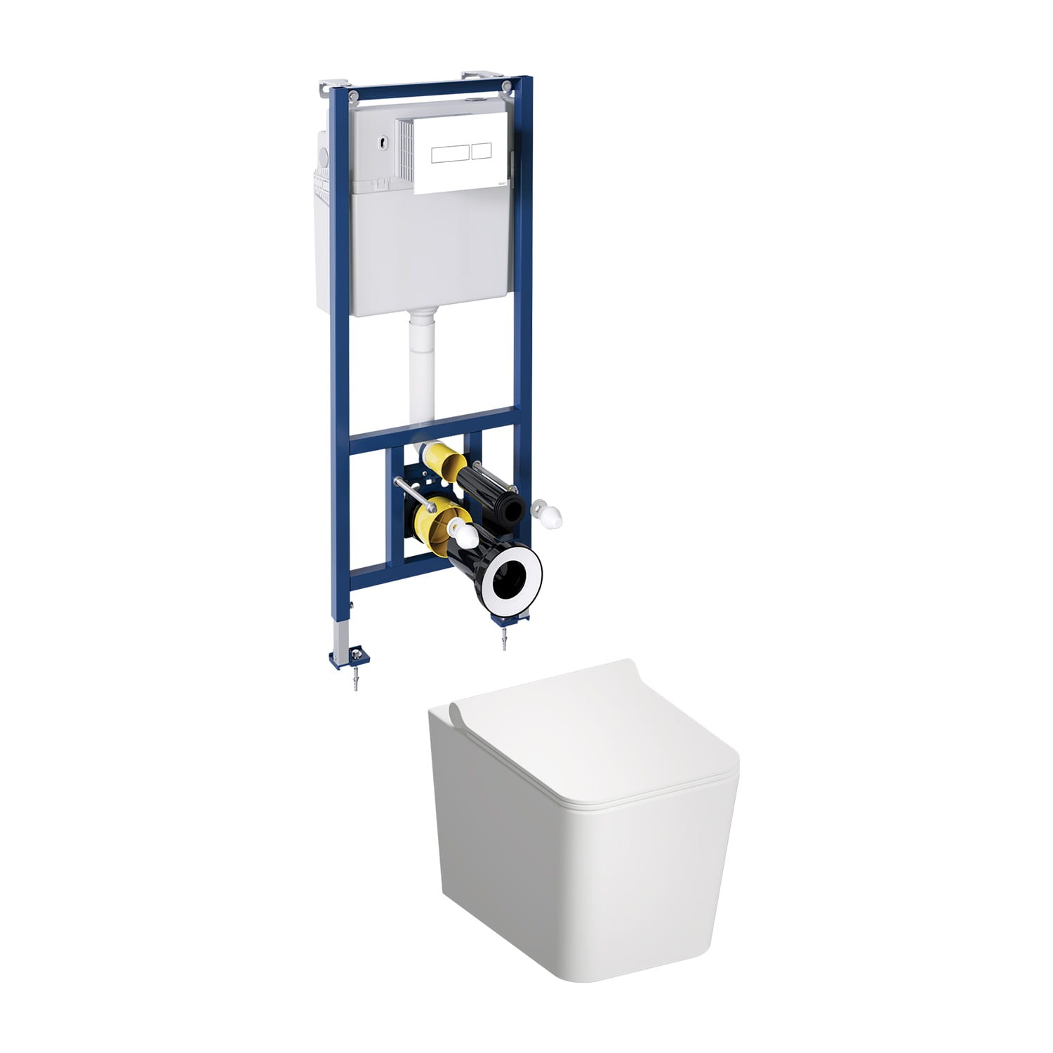 W zestawie znajduje się wisząca miska toaletowa OMNIRES BOSTON z deską wolnoopadającą oraz stelaż podtynkowy OMNIRES CLASSIC z białym przyciskiem spłukującym.