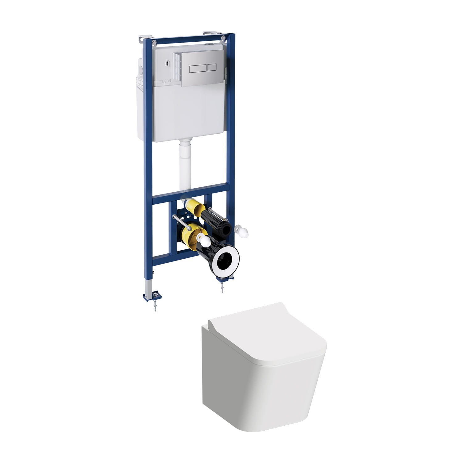 W zestawie znajduje się wisząca miska toaletowa OMNIRES FONTANA z deską wolnoopadającą oraz stelaż podtynkowy OMNIRES CLASSIC z chromowanym przyciskiem spłukującym.