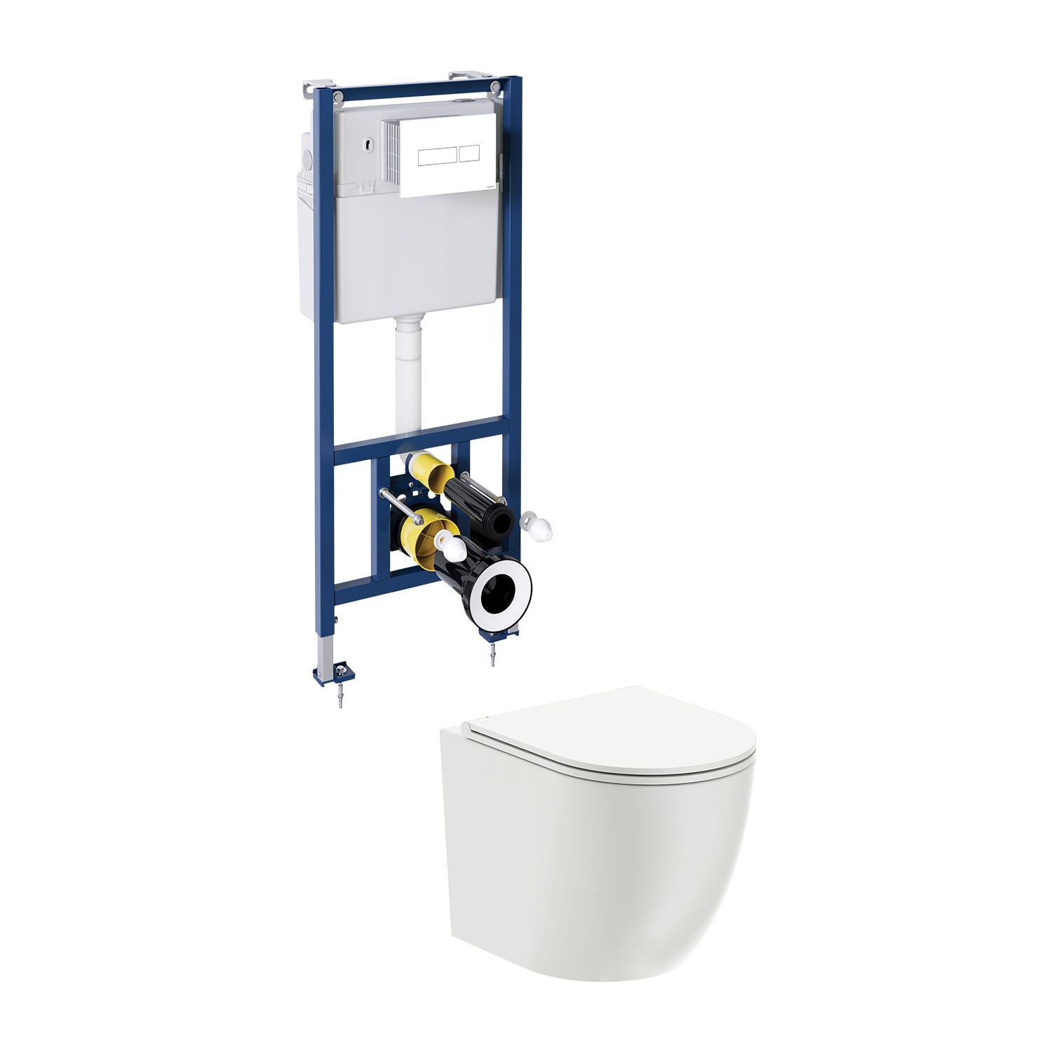 W zestawie znajduje się wisząca miska toaletowa OMNIRES OTTAWA z deską wolnoopadającą oraz stelaż podtynkowy OMNIRES CLASSIC z białym przyciskiem spłukującym.