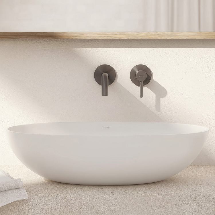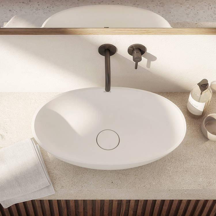 Umywalka nablatowa z kolekcji OMNIRES SHELL M+ charakteryzuje się współczesną eliptyczną formą, która miękką linią zwęża się ku podstawie. Minimalistyczna bryła wygląda lekko a zarazem solidnie, tworząc efekt wyrzeźbionego ze skały monolitu. Wewnątrz umywalki dopasowana maskownica dyskretnie zakrywa odpływ, nie zaburzając przy tym harmonijnie wyprofilowanej sylwetki.