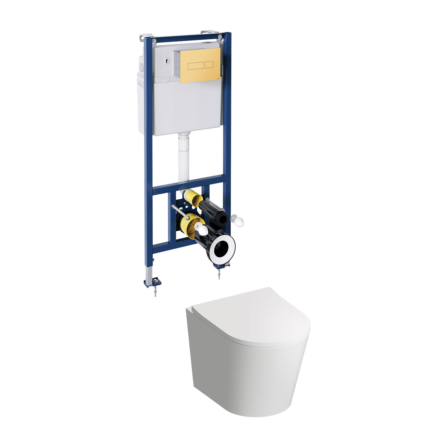W zestawie znajduje się wisząca miska toaletowa OMNIRES TAMPA z deską wolnoopadającą oraz stelaż podtynkowy OMNIRES CLASSIC ze złotym przyciskiem spłukującym.