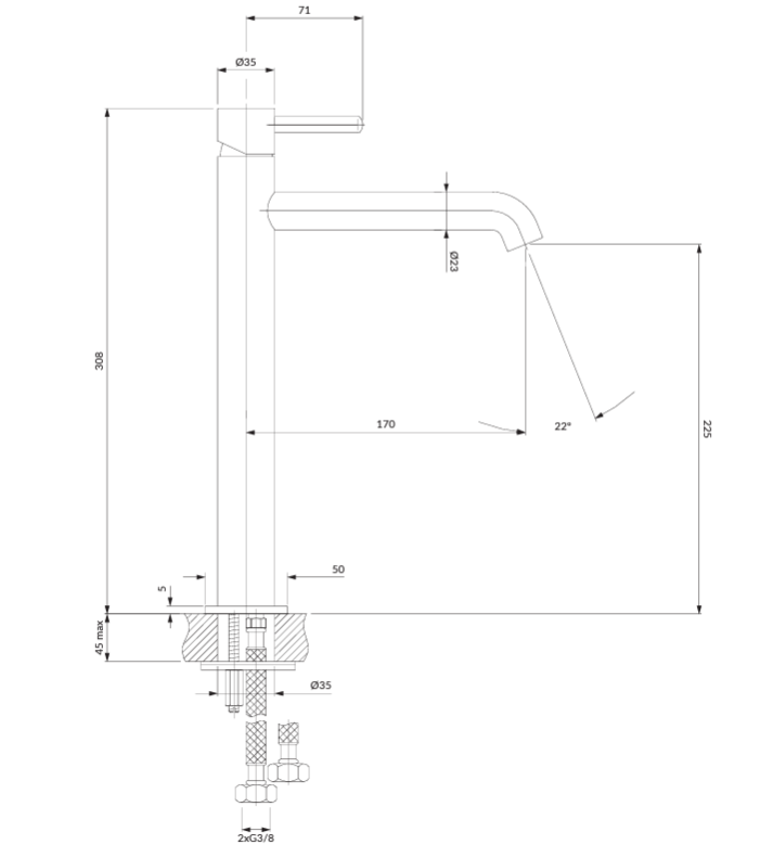 - wysokość wypływu wody: 22,5 cm