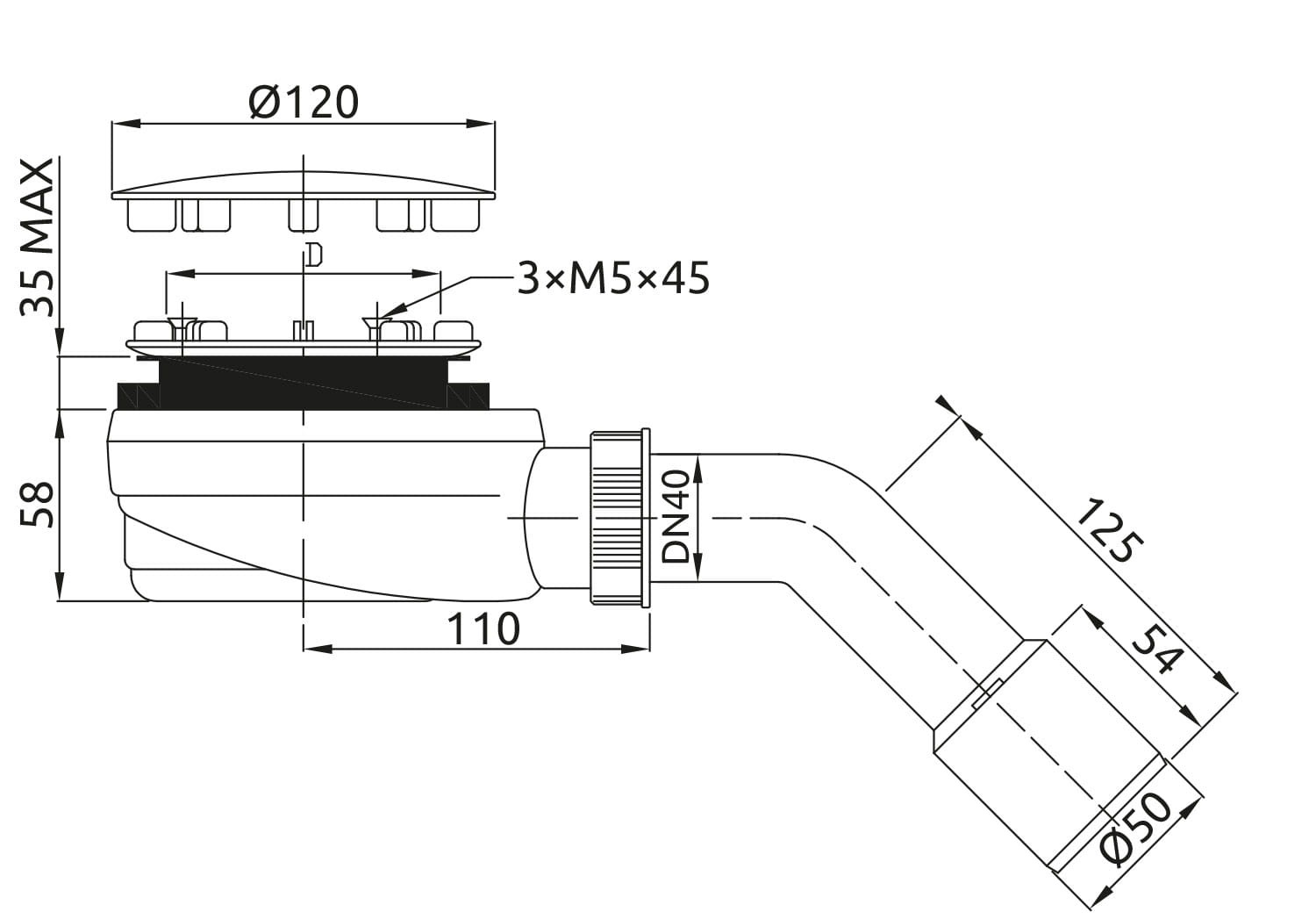 Syfon do brodzików czyszczony od góry, z podwyższoną prędkością spływu wody i łukiem odpływowym 135°.