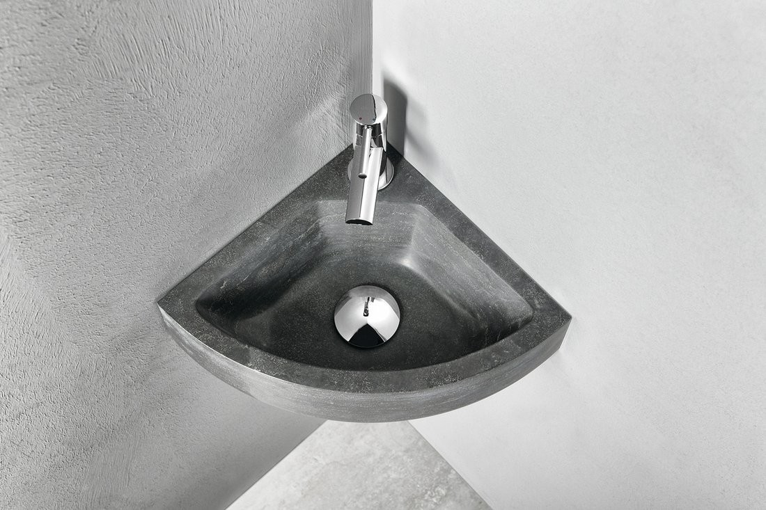 Kompaktowa umywalka narożna z kolekcji BLOK to idealne rozwiązanie do bardzo małych łazienek i toalet, gdzie liczy się maksymalne wykorzystanie przestrzeni. Wykonana z naturalnego kamienia w eleganckim, antracytowym kolorze, wyróżnia się unikalną strukturą – każda sztuka ma indywidualny rysunek i fakturę.