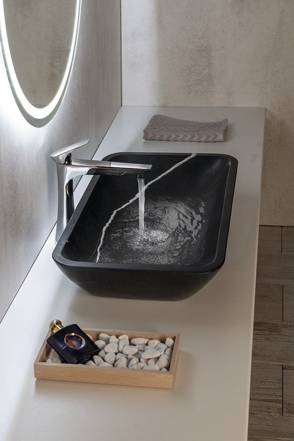 Surowy, chłodny charakter kamienia nadaje wnętrzu wyjątkowej elegancji i oryginalności, dzięki czemu umywalka doskonale sprawdzi się w aranżacjach nowoczesnych, vintage oraz rustykalnych.