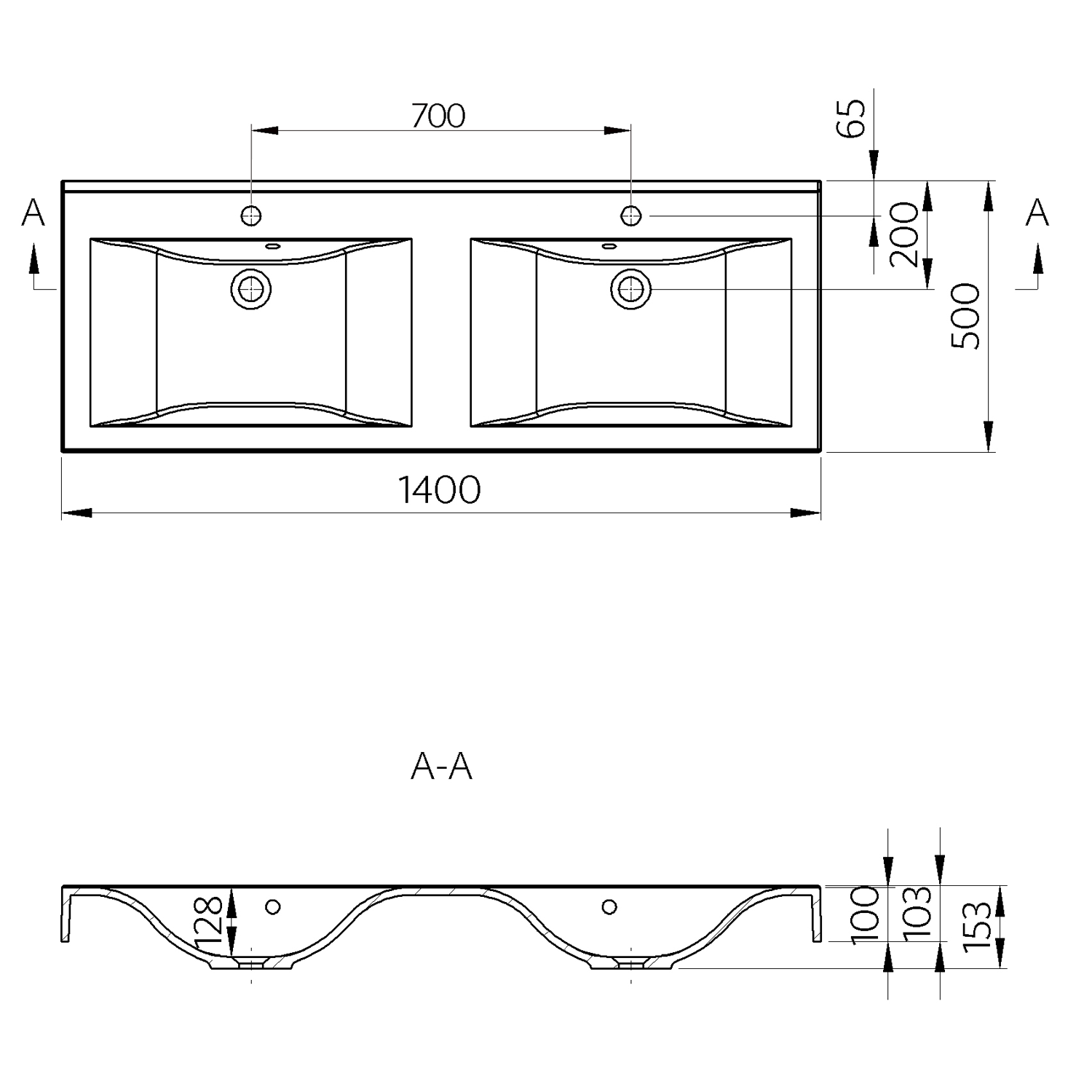 podwójna umywalka kompozytowa o szerokości 140 cm