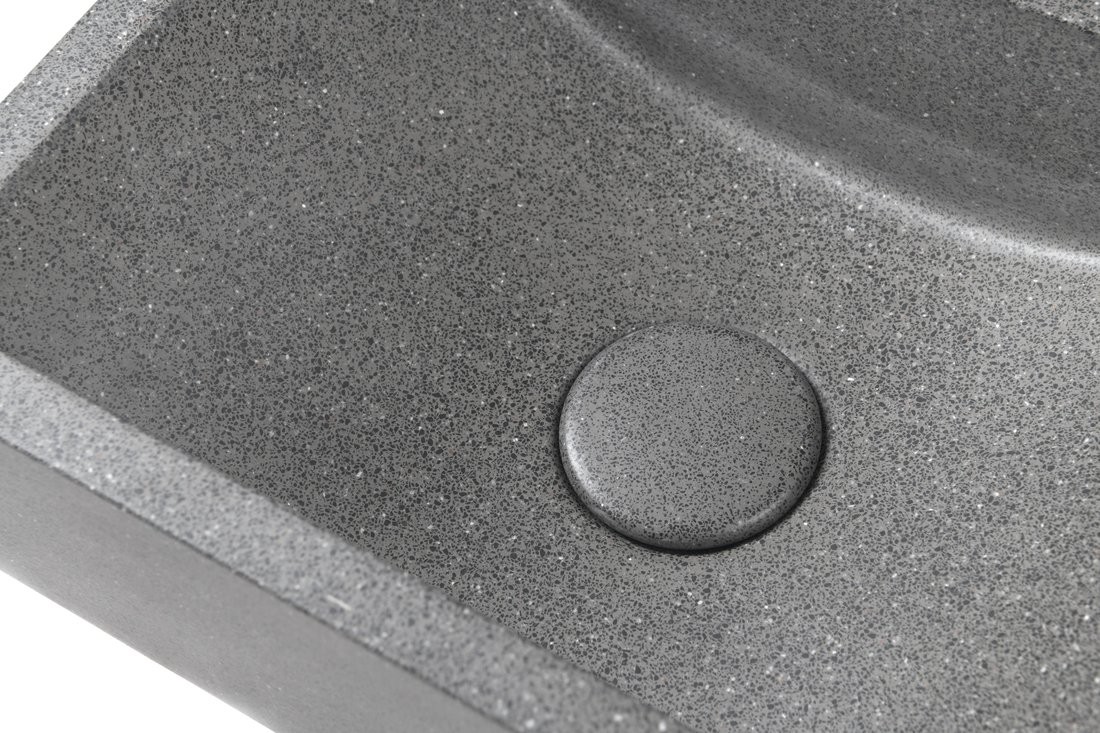 Nowoczesna i kompaktowa umywalka z serii CREST R to doskonałe rozwiązanie do małych łazienek oraz toalet. Wykonana z betonu w eleganckim wykończeniu czarnego granitu, wyróżnia się minimalistycznym, surowym designem, który idealnie wpisuje się w styl nowoczesny i industrialny.