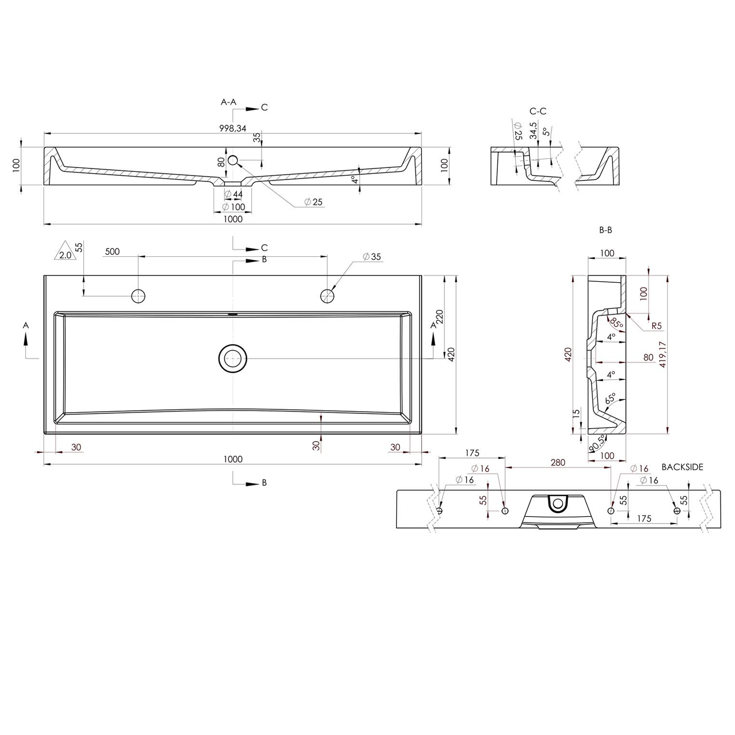podwójna umywalka kompozytowa o szerokości 100 cm