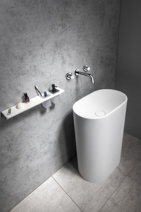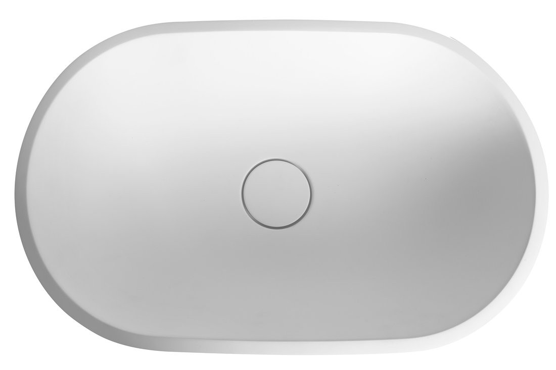 Umywalka posiada zintegrowaną pokrywę odpływu, która podkreśla jej minimalistyczny charakter. Model nie ma otworu na baterię ani przelewu, co pozwala na zastosowanie baterii ściennej lub wolnostojącej i stworzenie spójnej, nowoczesnej aranżacji.