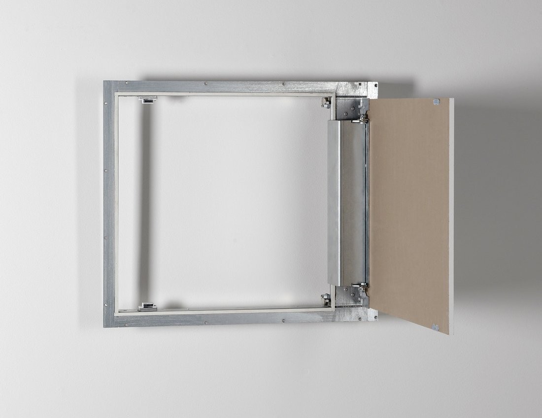 Solidna rama ze stali ocynkowanej gwarantuje trwałość i odporność na wilgoć, a skrzydło z płyty gipsowo-kartonowej umożliwia bezpośrednie wykończenie płytkami.