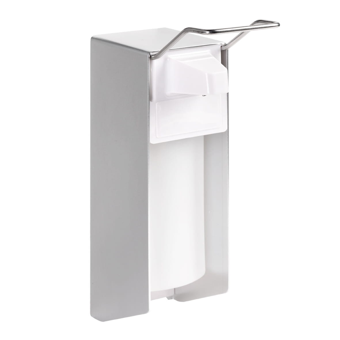 MODEL: 17.401 to dozownik do płynów dezynfekcyjnych o pojemności 0,5 litra. Posiada obudowę z aluminium oraz przednią pokrywę z białego ABS-u. Dozownik umożliwia łatwe uzupełnianie płynów z kanistra. Uruchamianie odbywa się za pomocą przycisku łokciowego wykonanego ze stali nierdzewnej, co zapewnia higieniczną obsługę bez konieczności bezpośredniego dotykania dozownika.