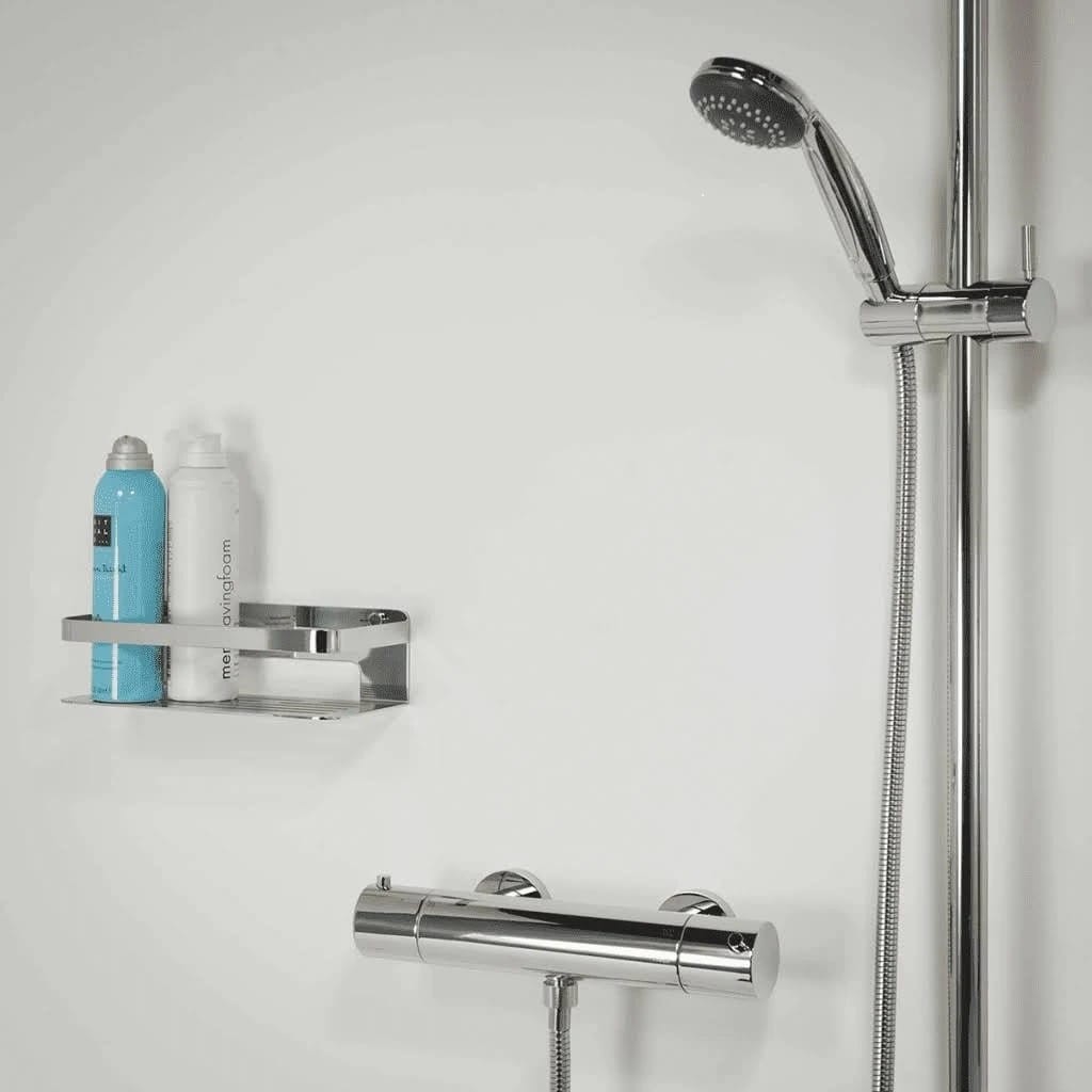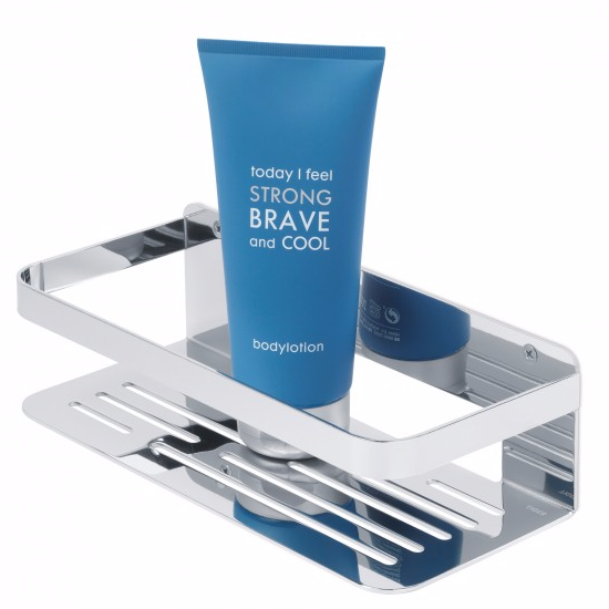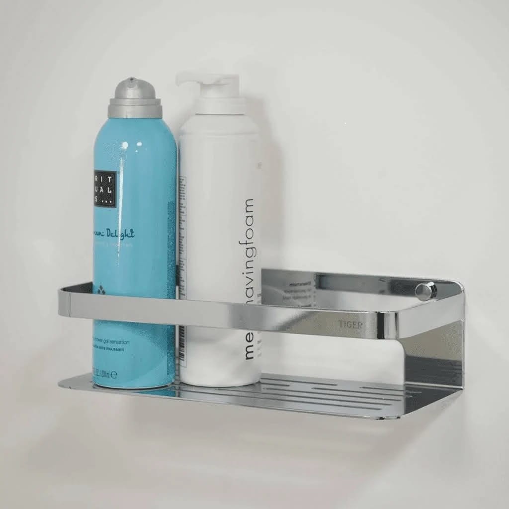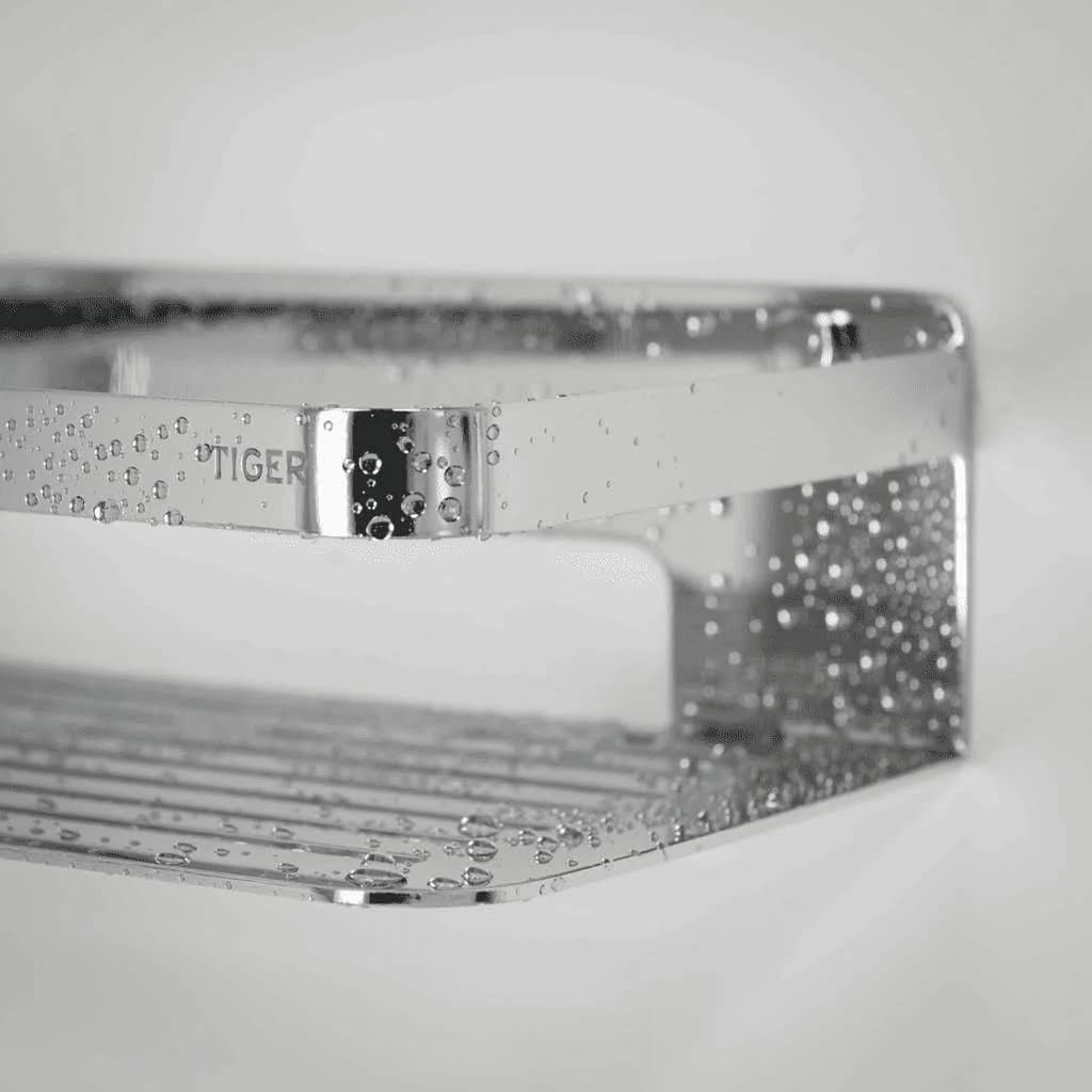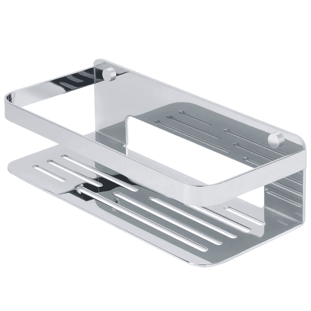Tiger 1400030346 Caddy Koszyk prysznicowy Chrom. Koszyk prysznicowy Tiger Caddy w atrakcyjnym, błyszczacym chomowanym wykończeniu zapewni, że wszystkie szampony, odżywki i żele pod prysznic będą teraz na wyciągnięcie ręki. Płaskie dno i wysokie ścianki zapewniają, że Twoje kosmetyki pozostaną bezpiecznie w koszyku. Ten koszyk łatwo zamontujesz w dowolnym miejscu na ścianie (elementy montażowe w zestawie), dzięki czemu kosmetyki będą zawsze w Twoim zasięgu.