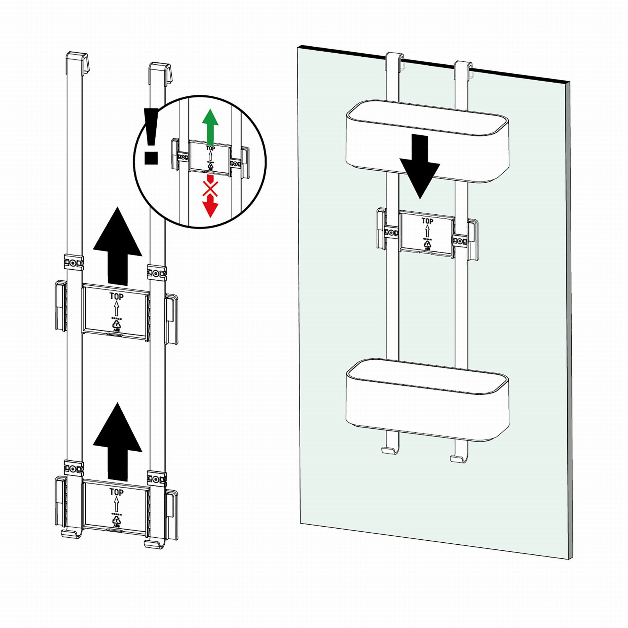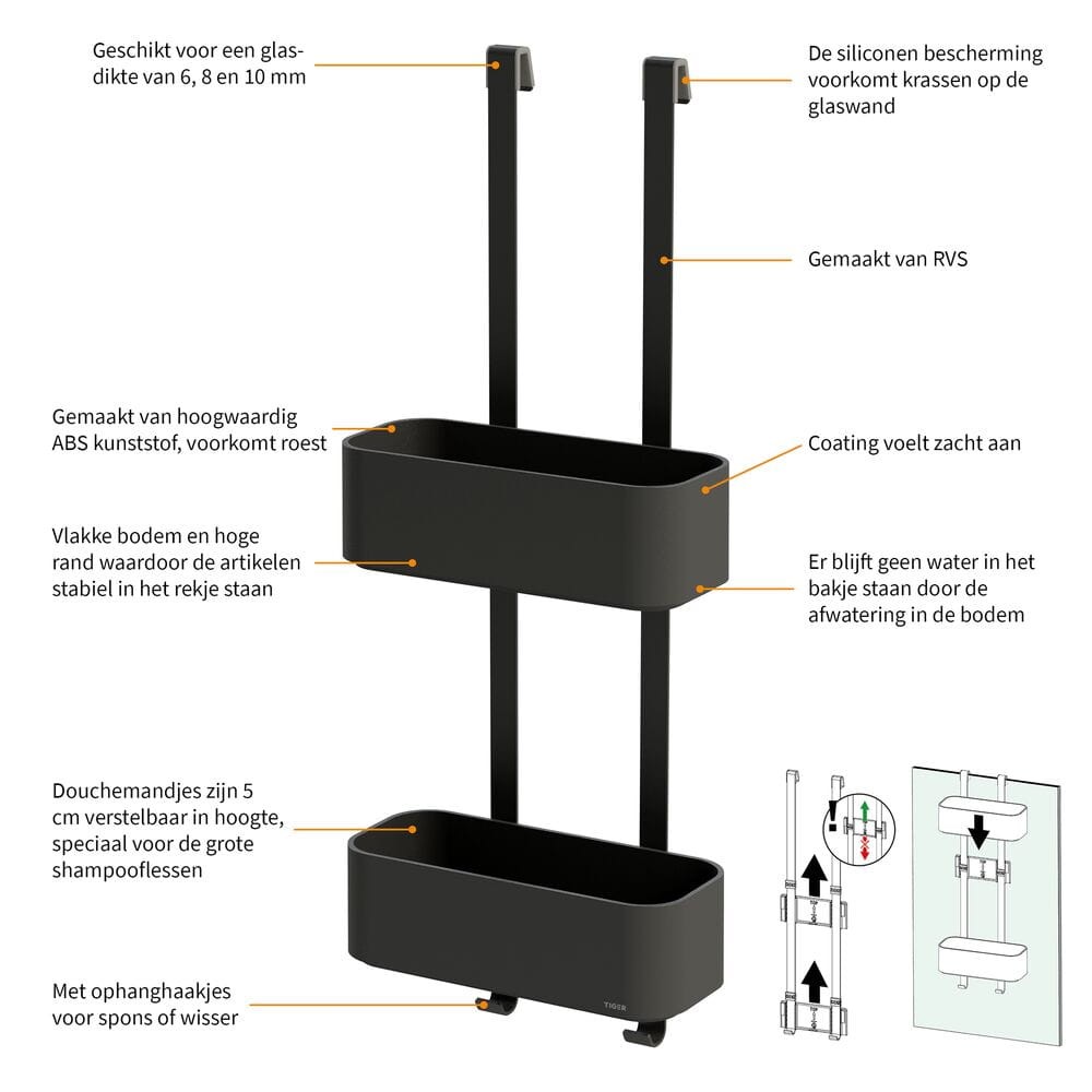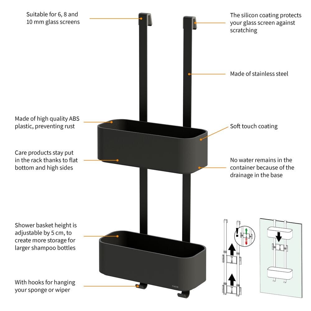 Z haczykami do powieszenia gąbki lub ściągaczki do wody Wysokość koszyka jest regulowana do 5 cm, co daje możliwość uzyskania dodatkowego miejsca na wysoką butelkę szamponu