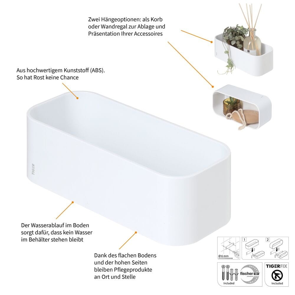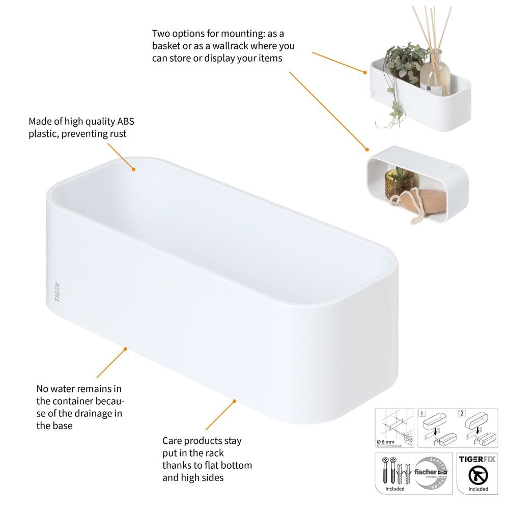 Produkty do pielęgnacji pozostaną na swoim miejscu dzięki płaskiemu dnu i wysokim ściankom TigerFix może być stosowany tylko na gładkich i twardych powierzchniach, ma bardzo silną przyczepność, a jego maksymalne obciążenie wynosi 10 kg TigerFix można usunąć bez uszkodzeń