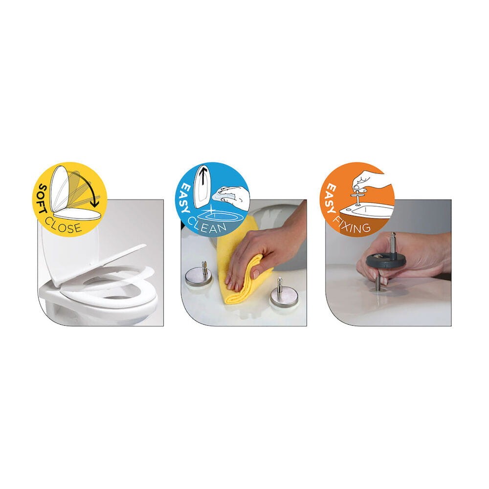 System delikatnego zamykania sprawia, że pokrywa i deska zamykają się miękko i cicho, co dodatkowo zapobiega uszkodzeniu ceramiki.