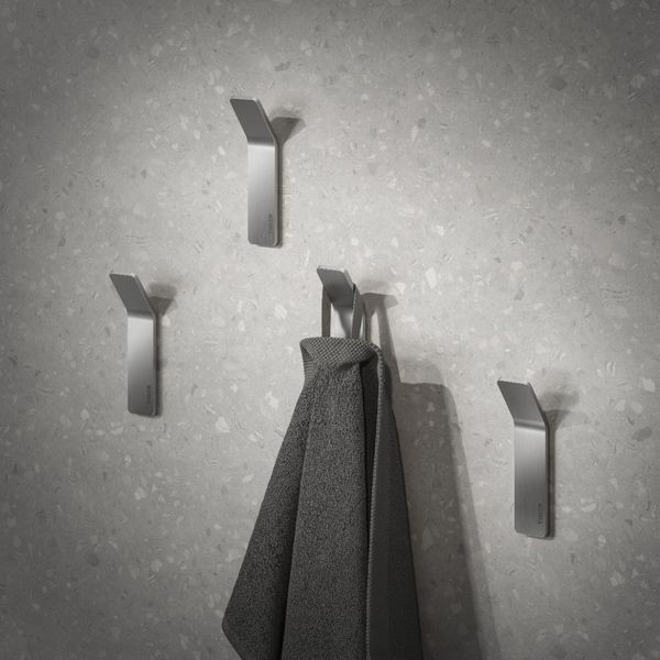 Seria dostępna jest w kilku wariantach kolorystycznych: szczotkowana stal, szczotkowane złoto, gun metal, matowa czerń oraz szary. Możesz zamontować kilka haczyków w jednej linii, tworząc spójną i funkcjonalną przestrzeń, lub łączyć kolory dla nowoczesnego efektu aranżacyjnego.