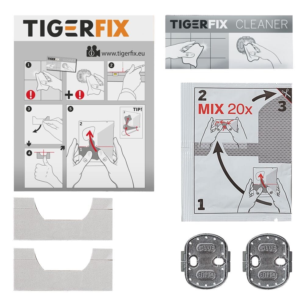 Przy użyciu opatentowanego systemu klejącego TigerFix można szybko i łatwo przymocować akcesoria łazienkowe do gładkich, twardych powierzchni. Dzięki temu produktowi dekorowanie łazienki akcesoriami Tiger jest wyjątkowo proste. Użycie tego kleju jest bardzo łatwe, po jego wymieszaniu można w szybki i prosty sposób nałożyć go na płytkę ścienną, a następnie po 4 godzinach zamontować akcesorium.