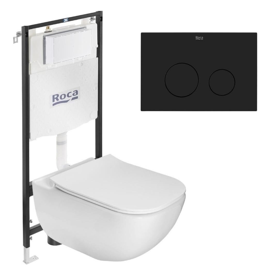 Zestaw podtynkowy VITALLE BY ROCA z miską podwieszaną bezkołnierzową, deską wolnoopadającą slim z duroplastu PALO i przyciskiem w kolorze czarnym mat to doskonały wybór dla tych, którzy poszukują stylowego i wygodnego rozwiązania do swojej łazienki.